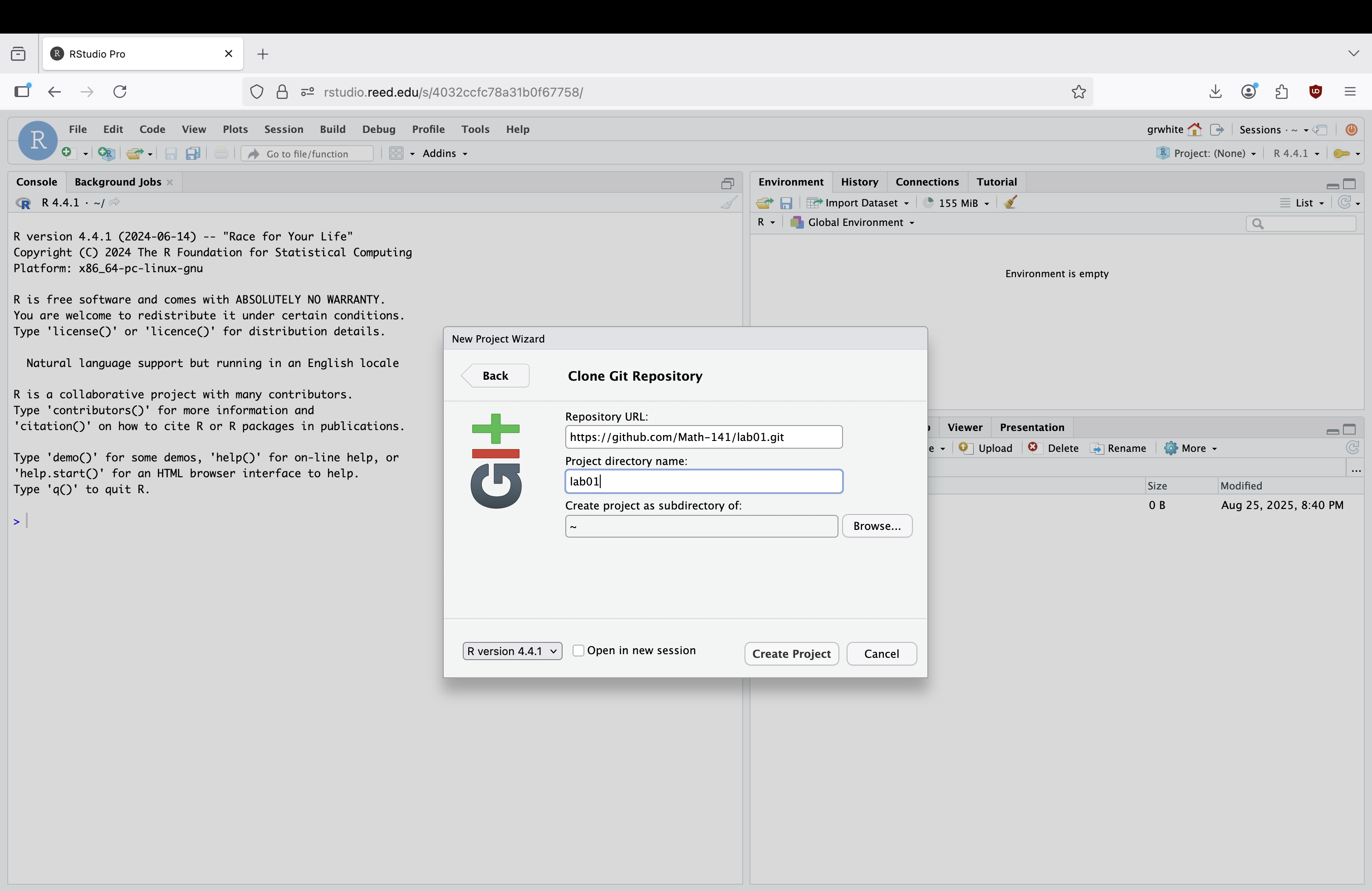 This link will always be the same, but updated for the lab number, e.g. https://github.com/Math-141/lab02.git for lab 2, https://github.com/Math-141/lab10.git for lab 10, etc. You won’t be able to access these projects until the day that the lab is released, though.↩︎