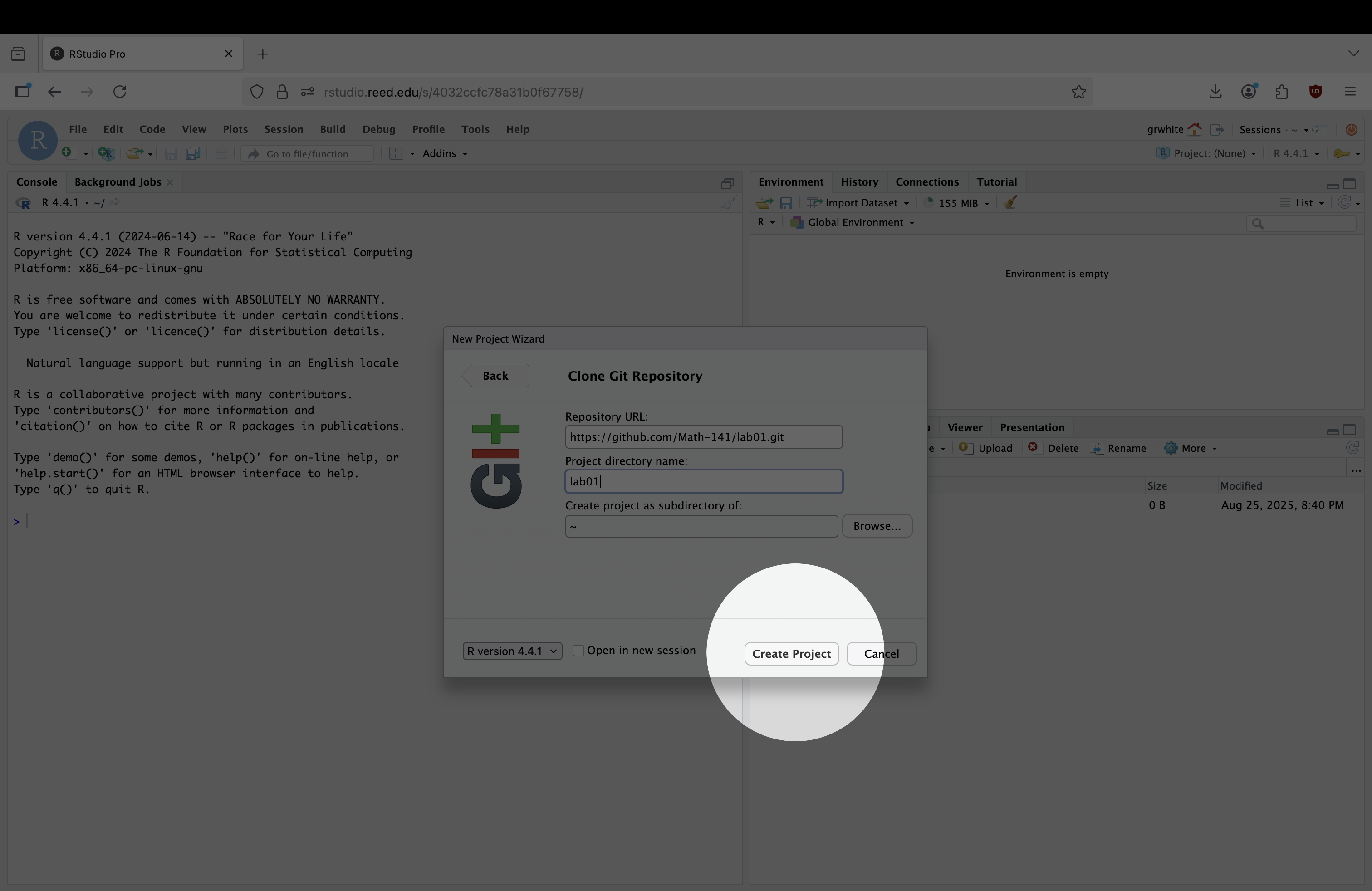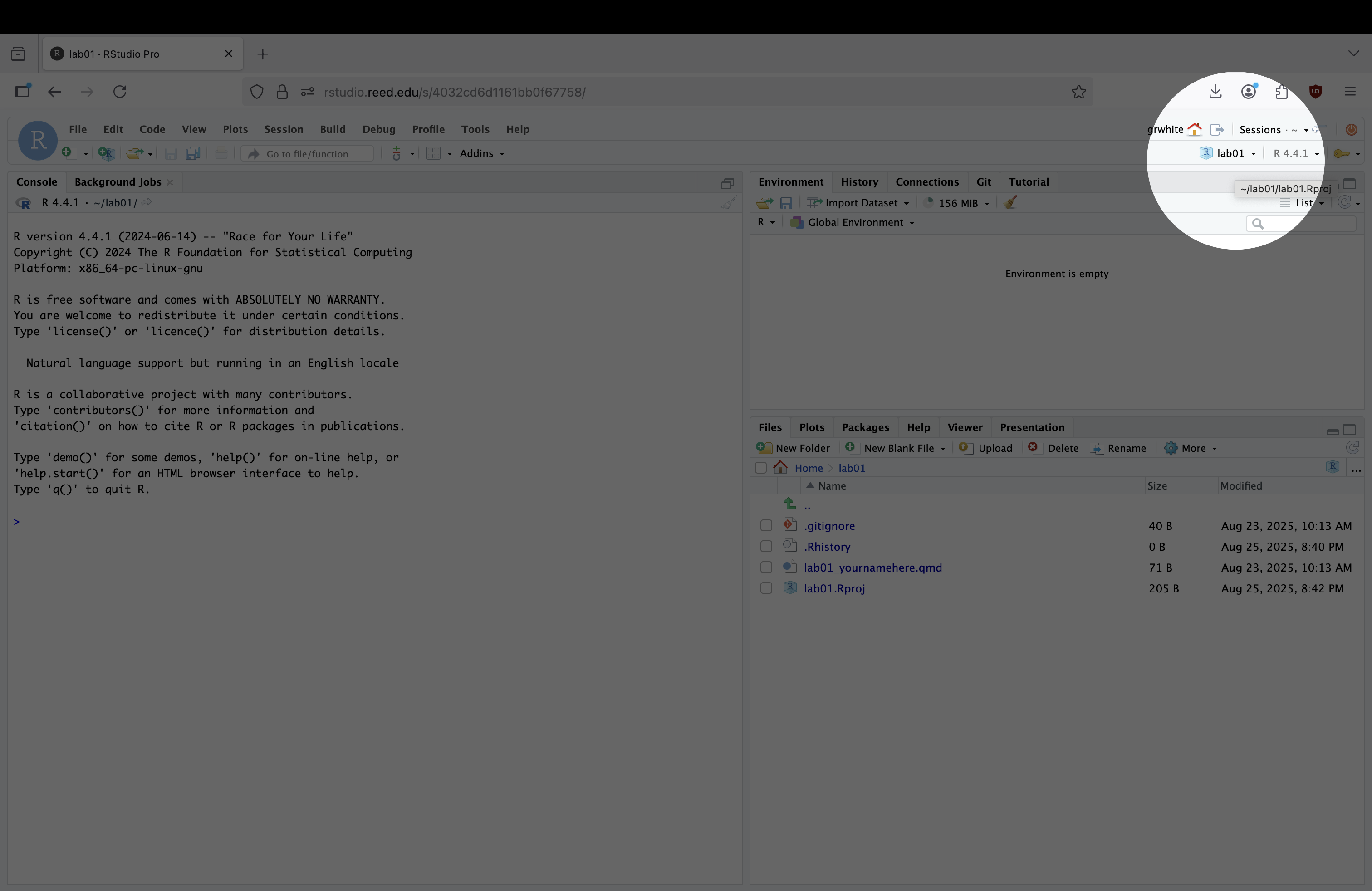 - Press “Create Project”. If all has gone well, you should see “lab01” in the top right corner of RStudio, and some new files for the lab in the bottom right corner of RStudio.