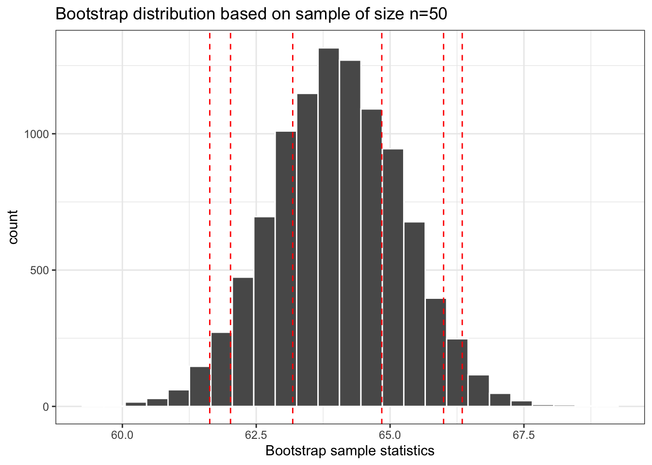 Supposed you’d like to know the average height of all Reedies (\(\mu\)). To help figure it out, you’ve collected a sample of 50 Reedies and measured their heights. You find that the sample mean \(\overline{x} = 64\) inches. Based on your sample, suppose you calculate a bootstrap distribution based on 10,000 re-samples from your sample. The bootstrap distribution is shown below, as well as the 0.025, 0.05, 0.25, 0.75, 0.95, and 0.975 quantiles of the bootstrap distribution (shown as vertical lines in the histogram as well).