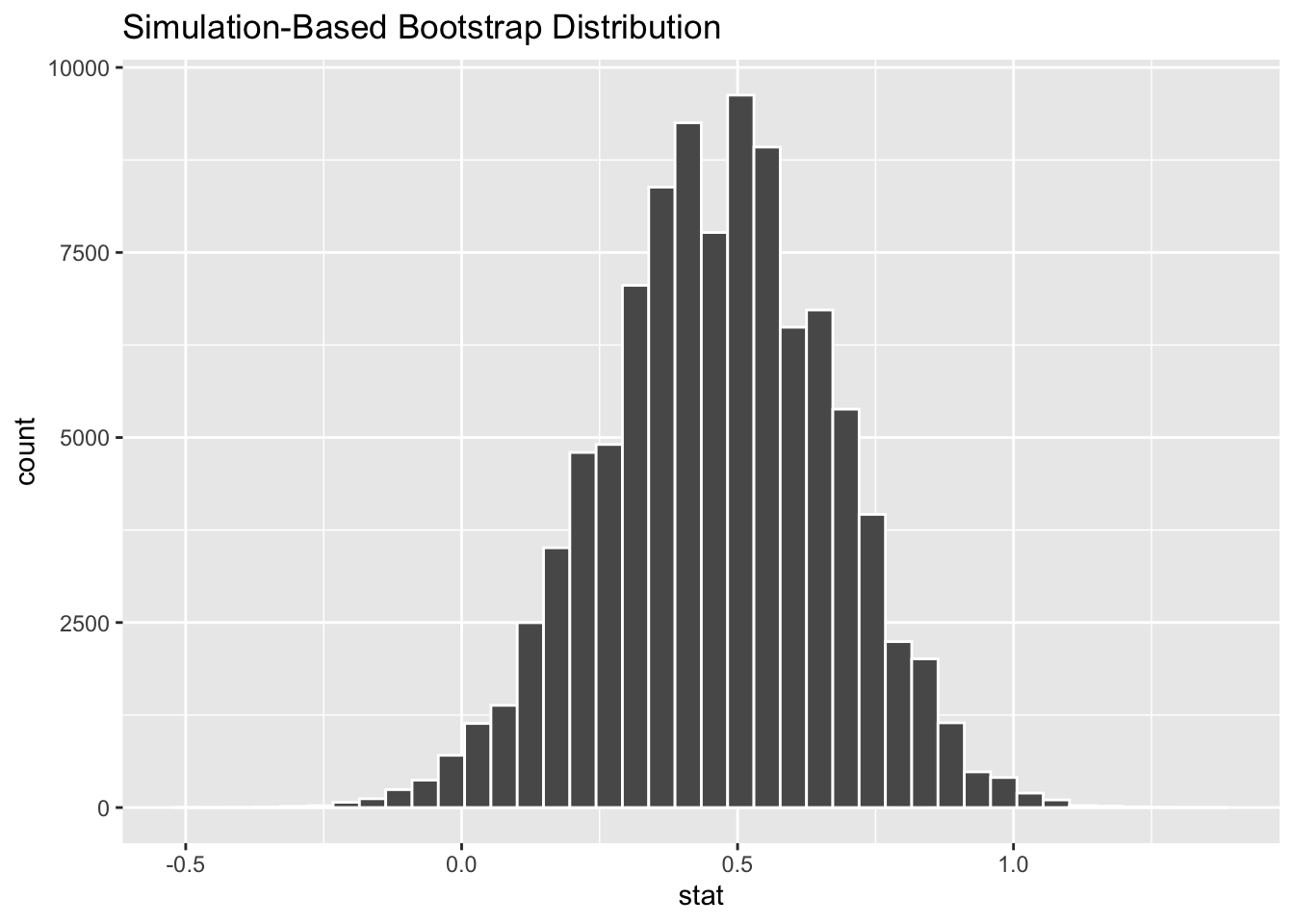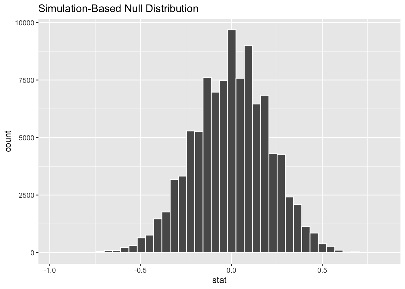 Consider the live coding example we did in class on Friday (I’ve included a version of this code below). Explain what each line of code is doing. Also, make the connection between the confidence interval and hypothesis test. What would be true (i.e. different than the one presented here) about the 95% confidence interval if the hypothesis test at the \(\alpha = 0.05\) level lead us to fail to reject the null hypothesis?