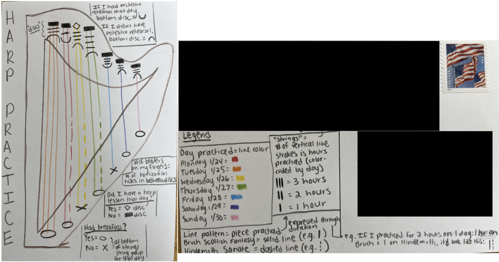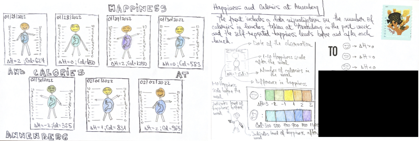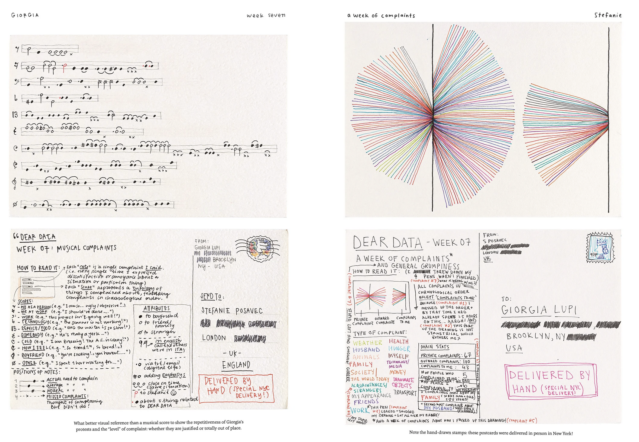 “Each week, and for a year, we collected and measured a particular type of data about our lives, used this data to make a drawing on a postcard-sized sheet of paper, and then dropped the postcard in an English”postbox” (Stefanie) or an American “mailbox” (Giorgia)!“