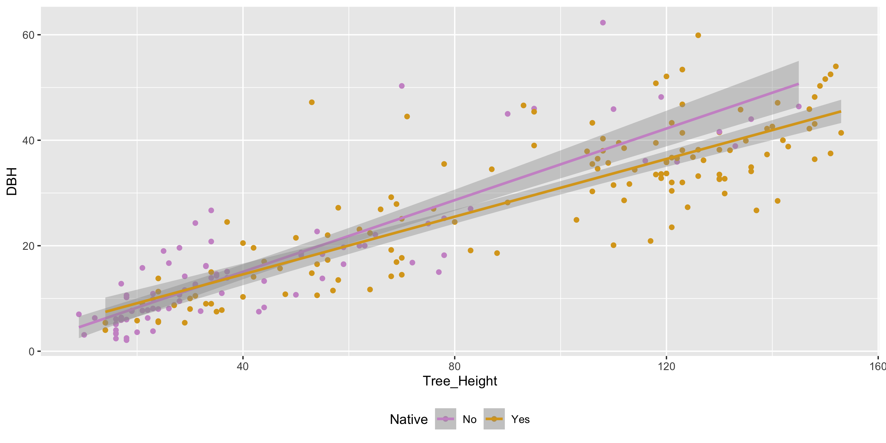 modTrees <- lm(Tree_Height ~ DBH*Native, data = kenilworth)