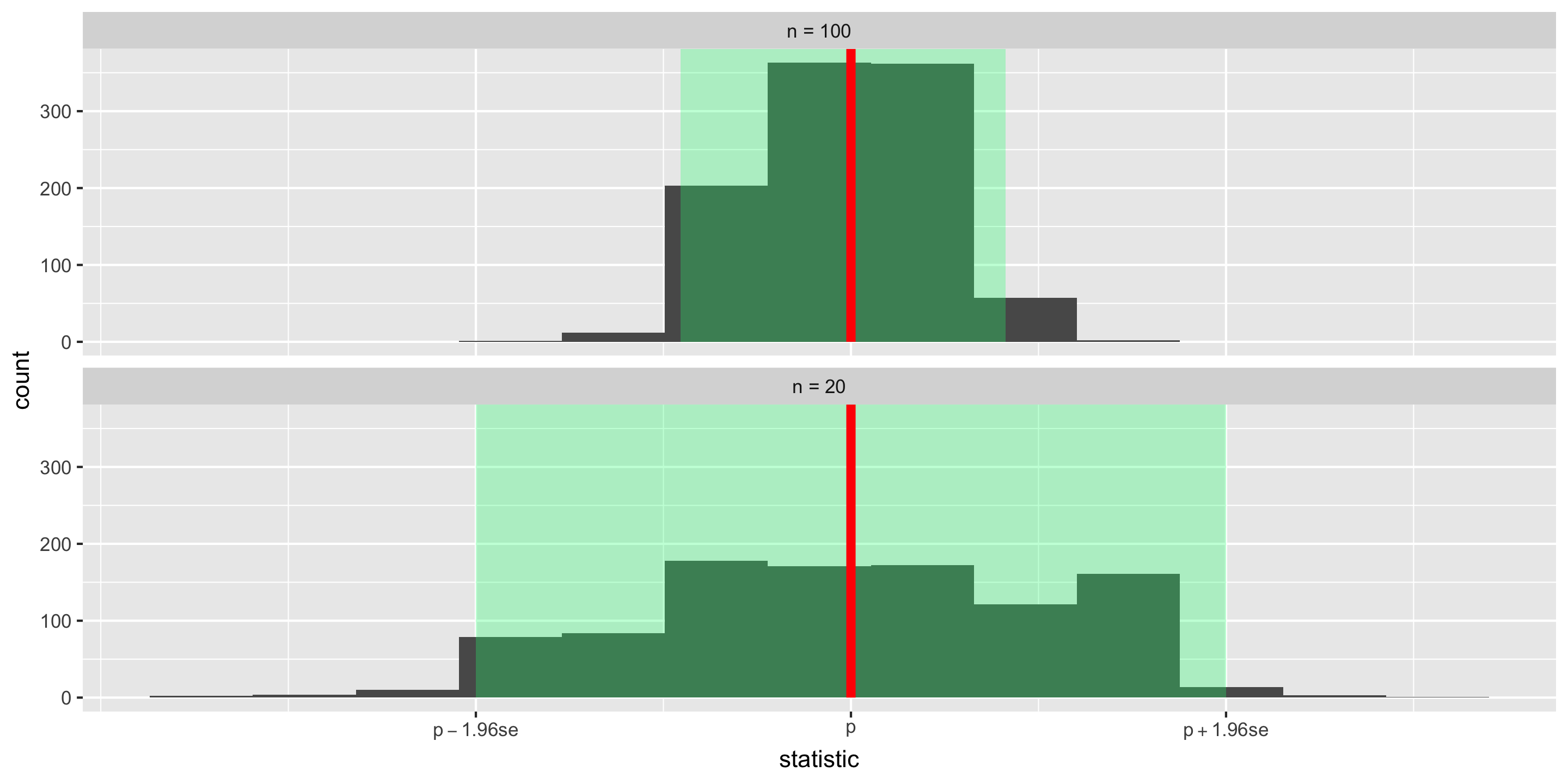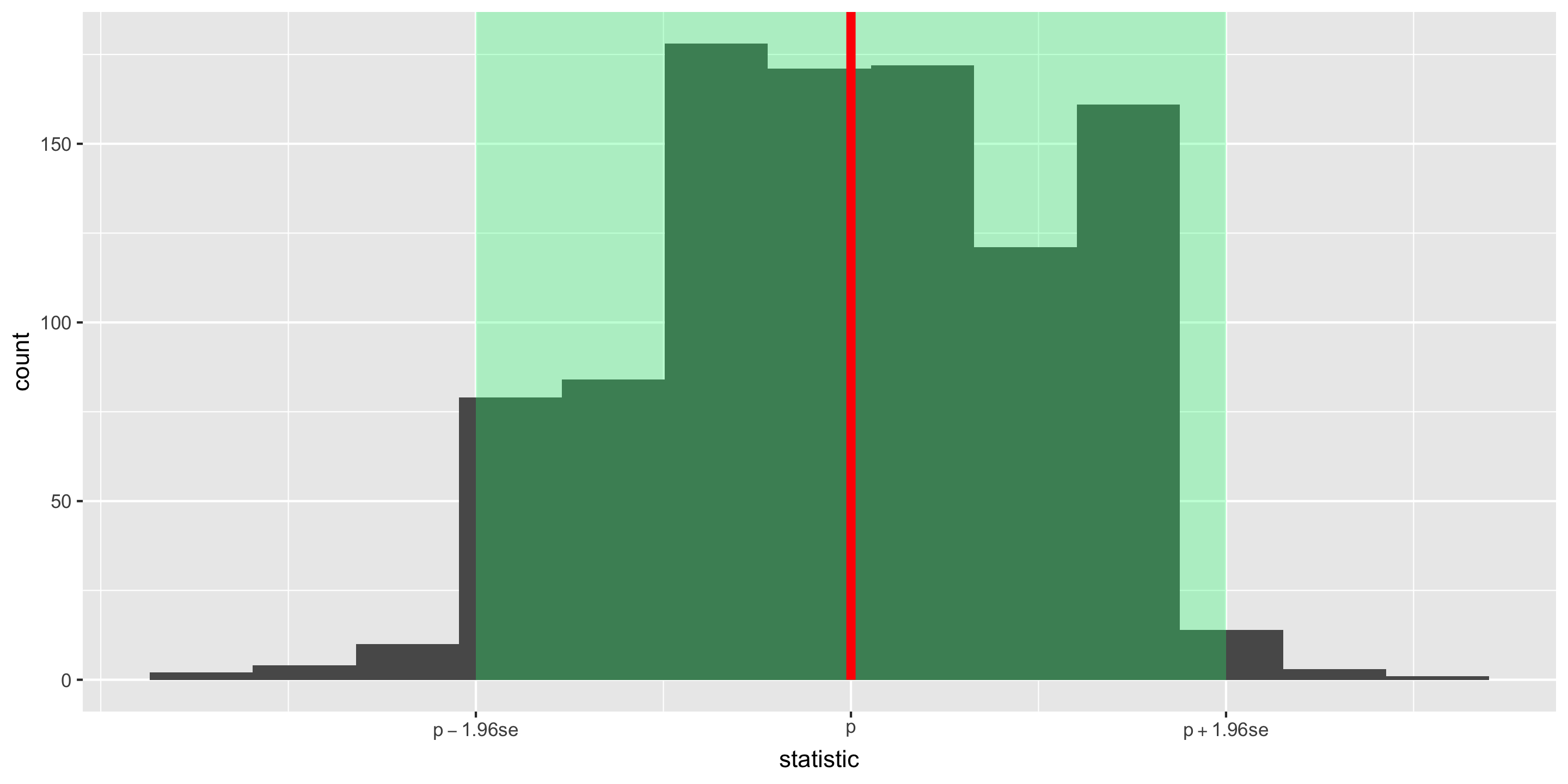 So 95% of all sample statistics, \(\hat p\) fall within 1.96 standard errors of \(p\)!