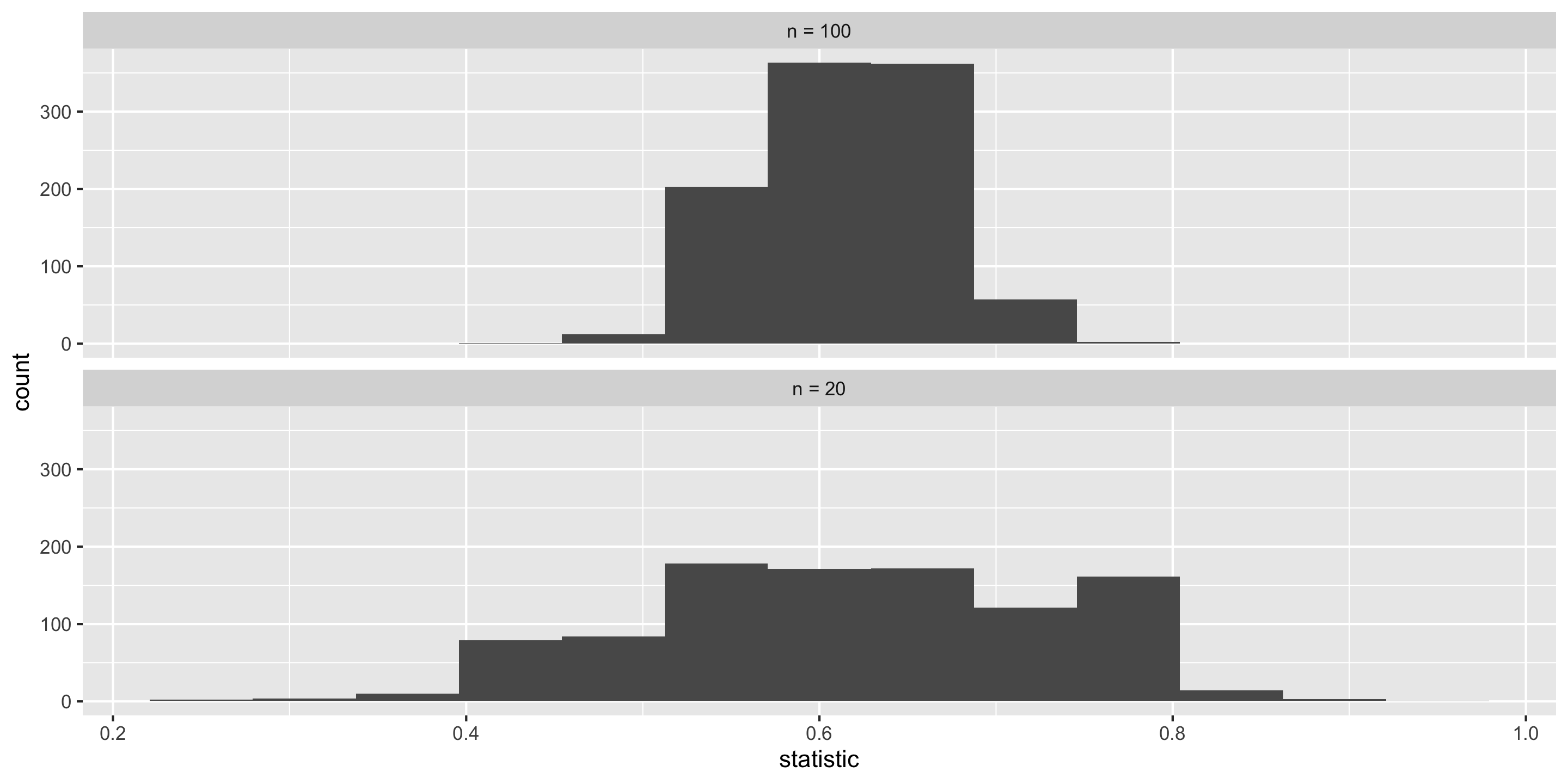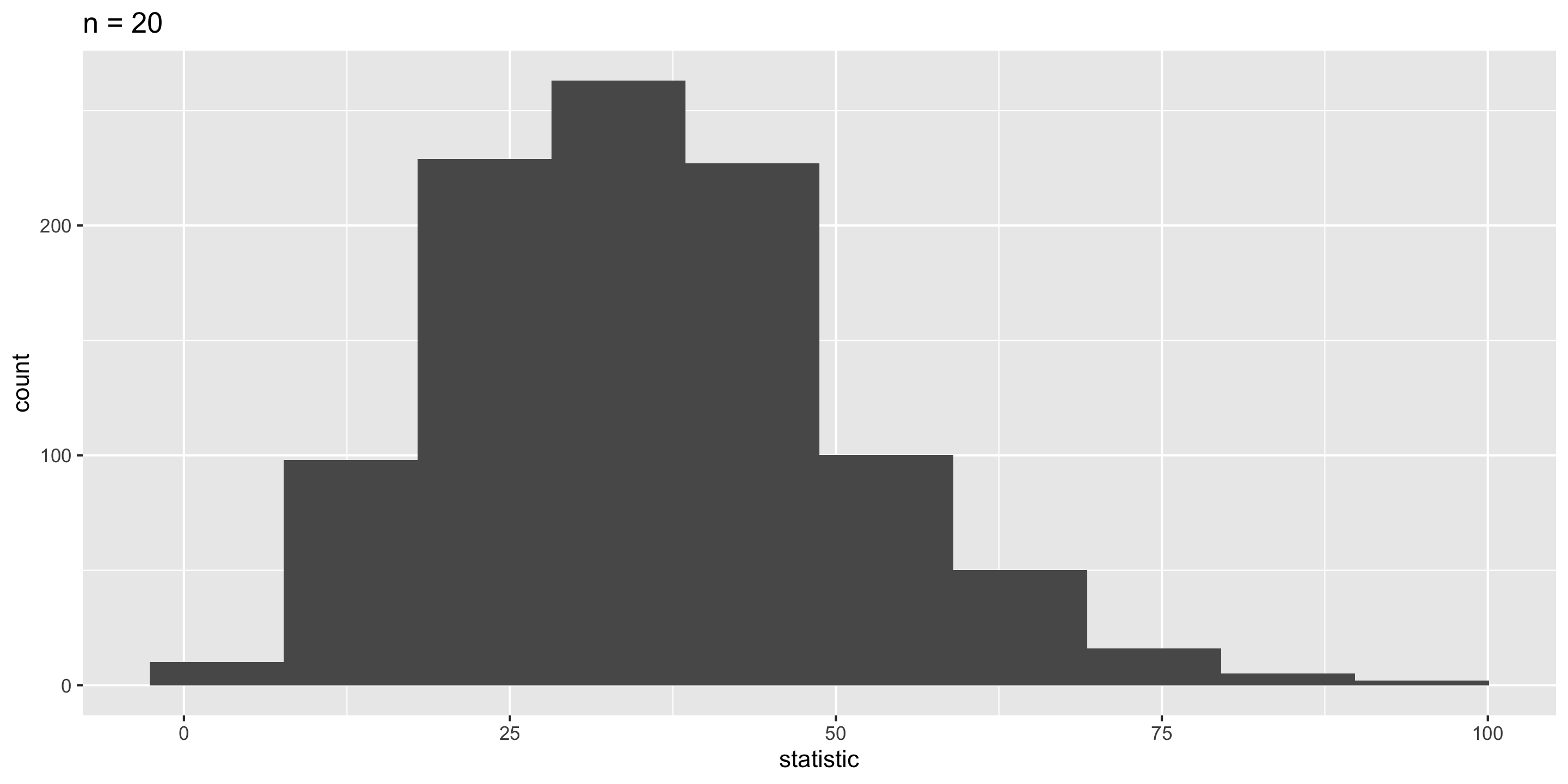 What happens to the sampling distribution if we change the sample size from 20 to 100?